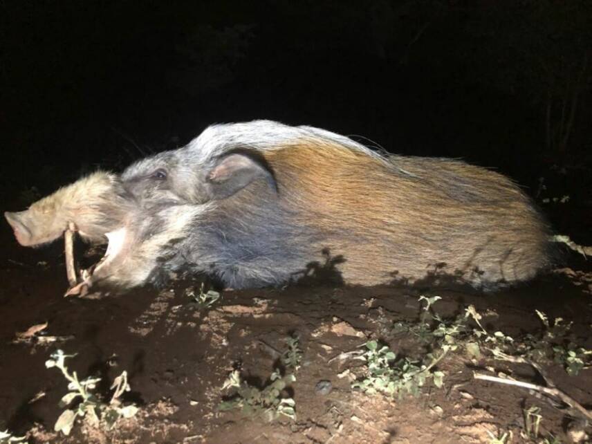 We hunted this bushpig using the baiting method and a red light that was placed in the tree connected to a dimmer switch. This was then controlled from our hide. We had been baiting the bushpigs for roughly one week before we were able to connect with them. Our initial struggles set in because we were leaving too early, while the camera trap situated at the bait showed them coming to feed after midnight.