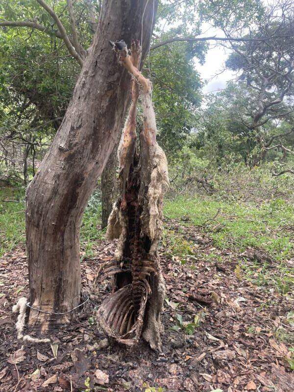 You drag it for anywhere from 25-50 yards, simulating a blood trail for animals to find and follow. You repeat this process for a few miles in all directions around your bait pile, ensuring that all the trails end around your bait pile. We also decided to tie a sheep carcass around a tree and tightly securing it with wire. The sheep’s stomach was then opened and its feces spread over nearby trees. This created an irresistible stench that almost every night critter would be wanting to investigate. The wire around the carcass ensured that it didn’t come off because when you are Hyena hunting, the Hyena will generally try and drag the carcass back to their dens, meaning they may not appear for the next few nights.