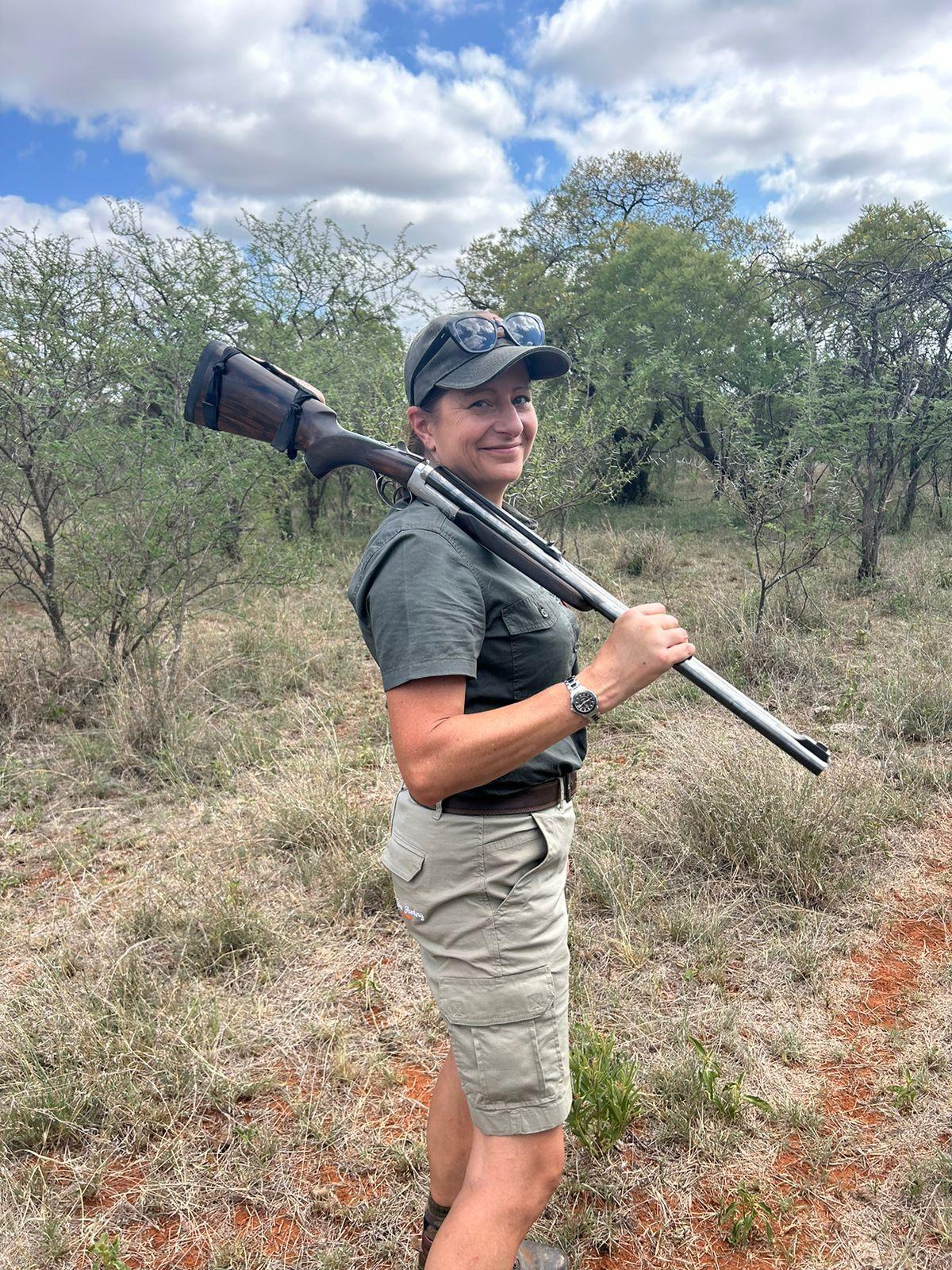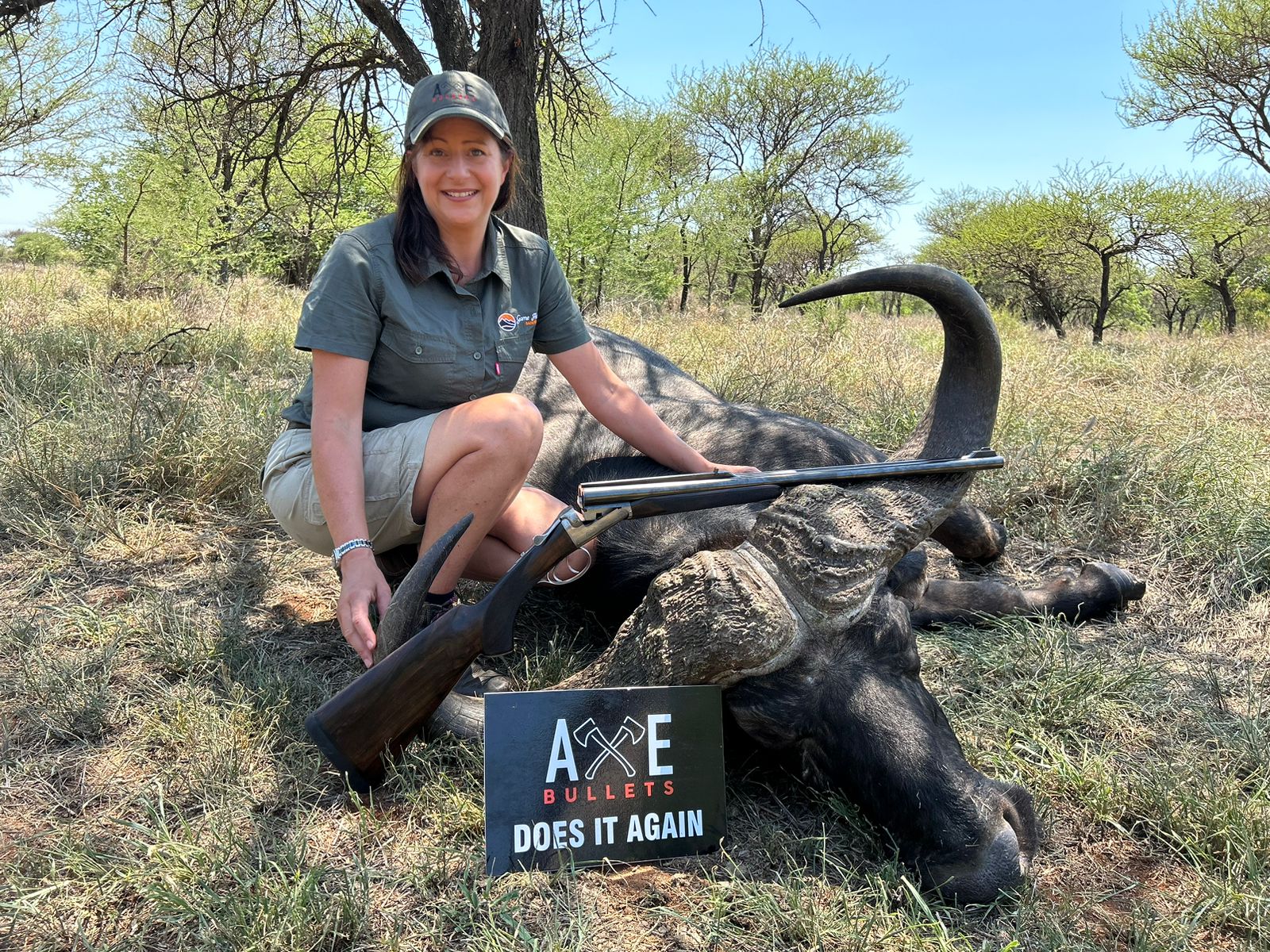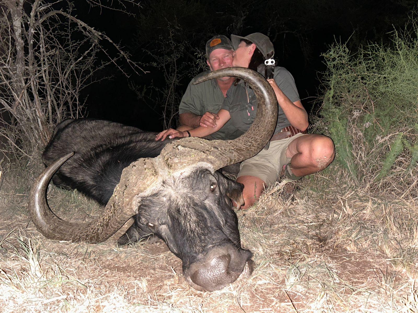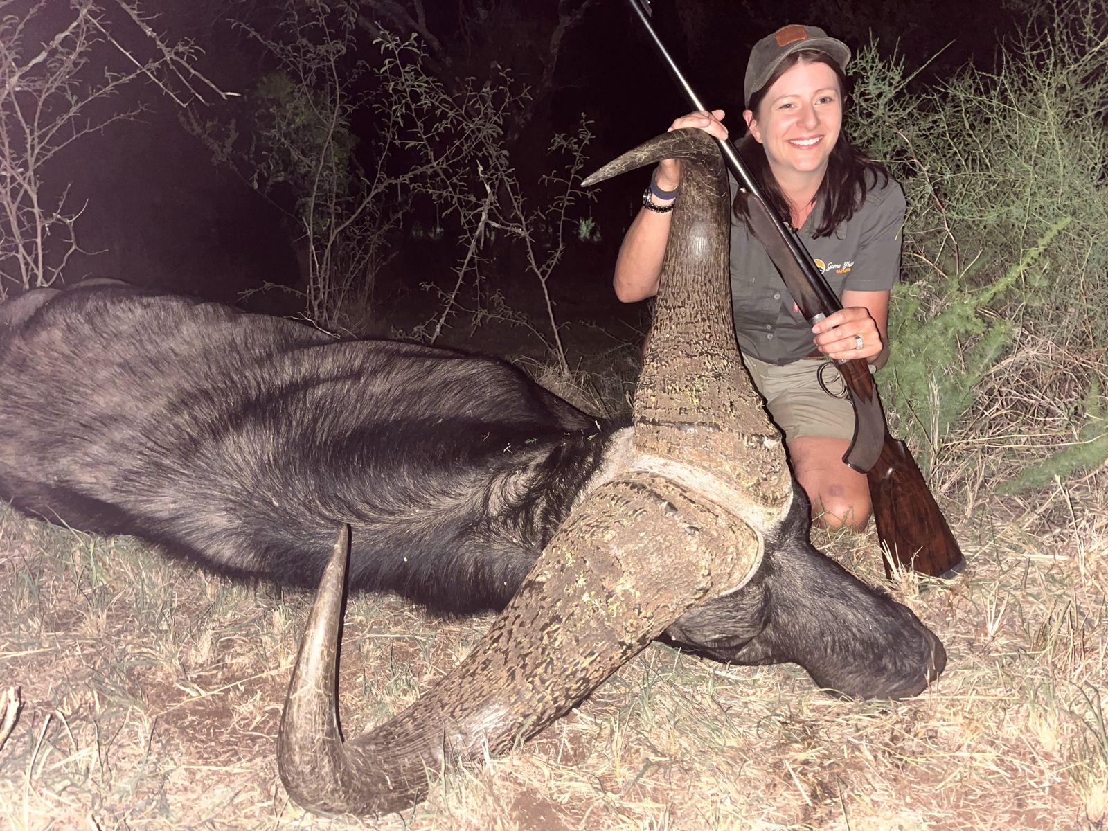 Stalking a Cape buffalo is a game of nerves and skill. These animals have keen senses and can disappear into the thick bush with surprising speed. I was fortunate enough to be using by husbands .500NE, which is an incredible rifle. They always say that you need to make the first shot count but unfortunately, my first shot was not ideal. I shot my Cape Buffalo low in the brisket which resulted in hours of walking and tracking this formidable beast. This was also not the ideal time of year (November) to be on a long walk and stalk. It was summer and seriously hot and humid and ticks in abundance. Always approaching with utmost caution, aware that a wounded buffalo can become extremely dangerous, capable of launching a lethal charge with little warning. At times we were stalking through bush so thick that we only had about 7-10yards visibility. I tell you it is nerve-wracking stuff and not for the faint hearted. I had quite a lengthy conversation with the Man upstairs making all sorts of deals to make sure I survived. There is nothing quite like stalking after a wounded buffalo to encourage some deep introspection.