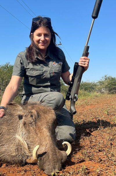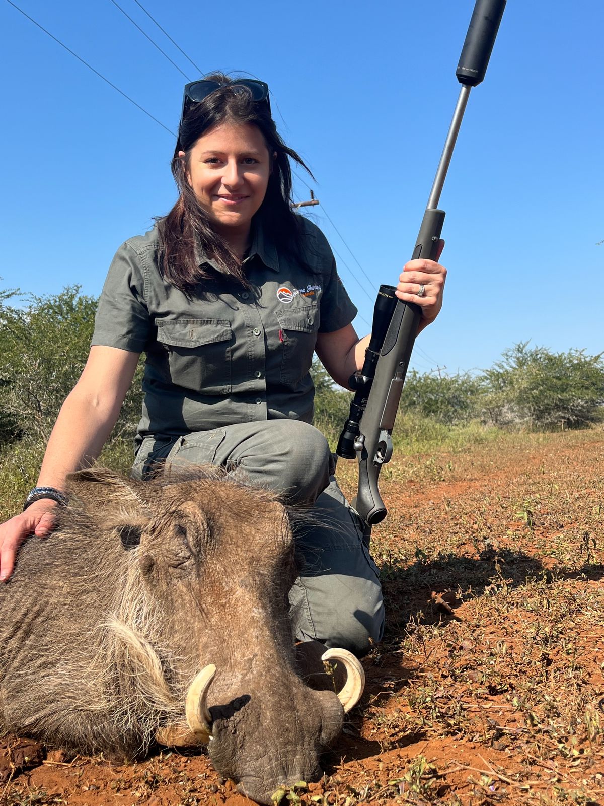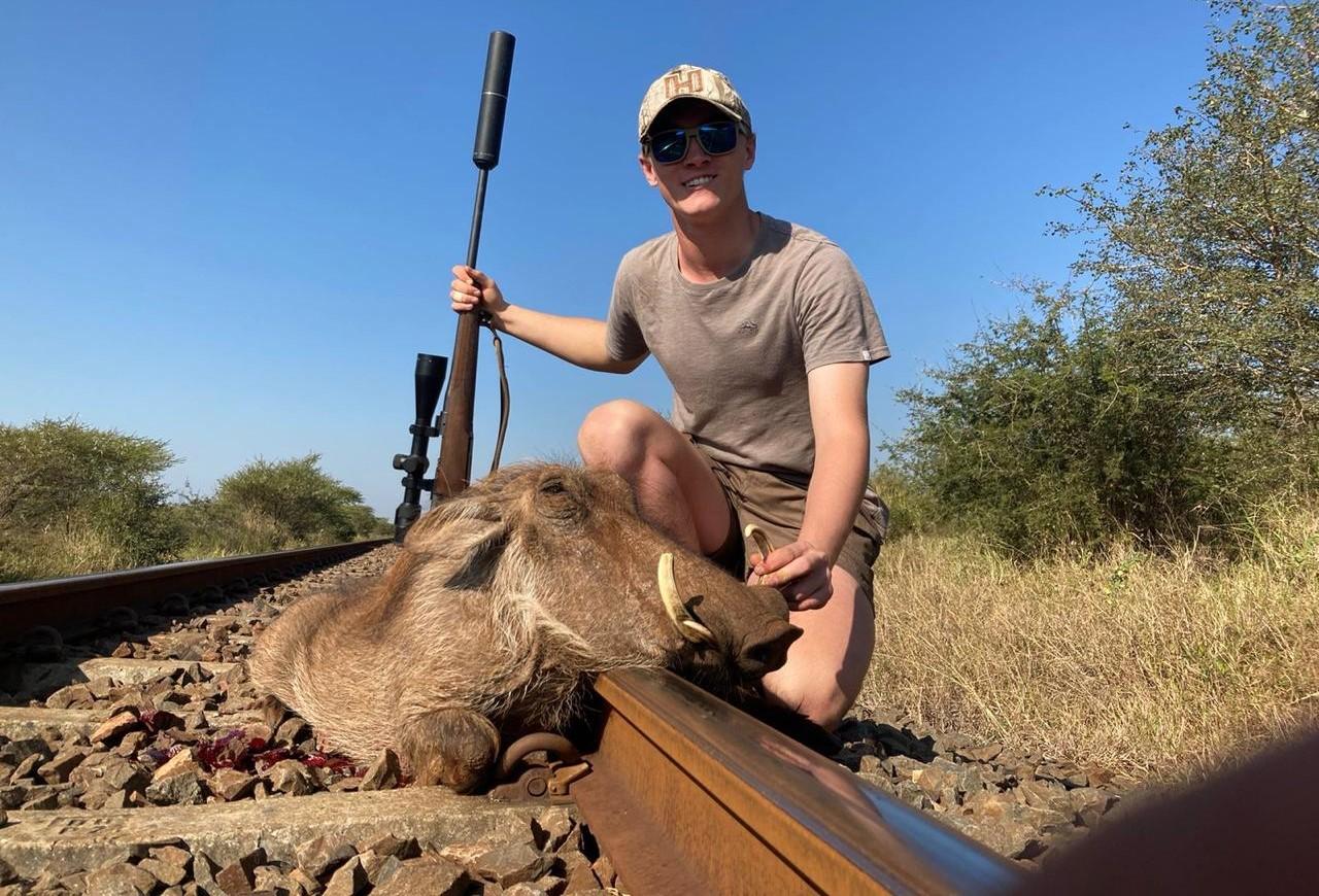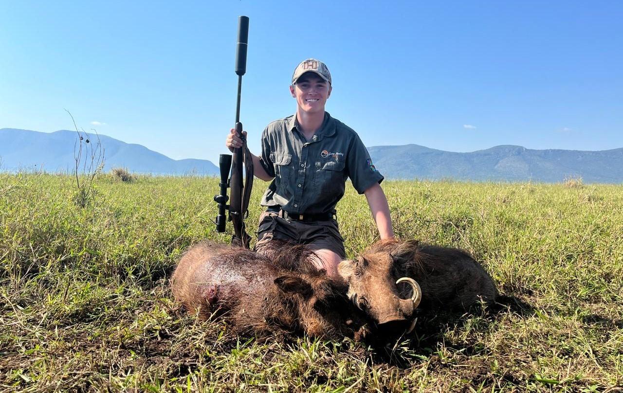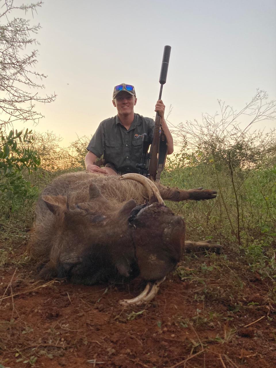 Logan was up at the crack of dawn every day, setting out on foot with the professional hunter. Having missed one, Logan still managed six all in all. Two of these were huge trophy pigs. The warthog tusks in this area of South Africa do tend to get bigger due to the softer sand which does not eat away at the tusks while the pigs dig up the vegetation.