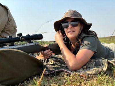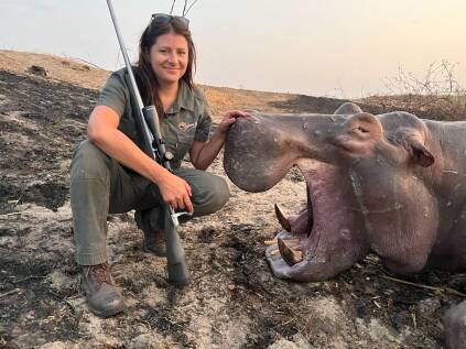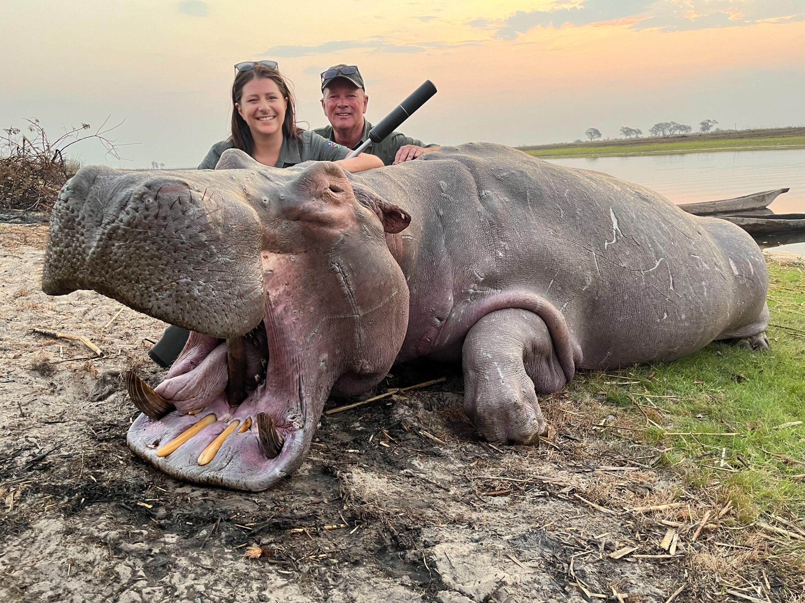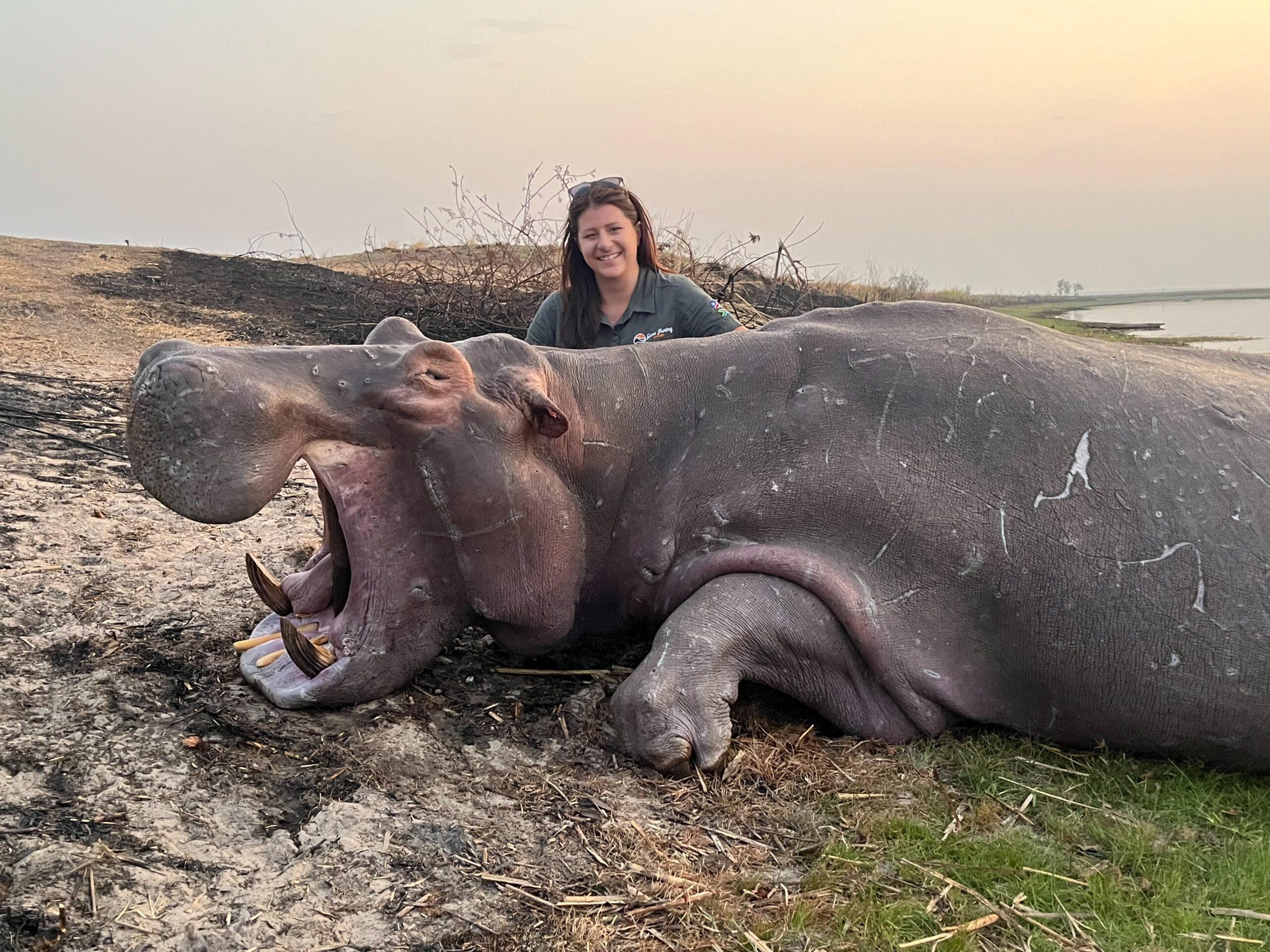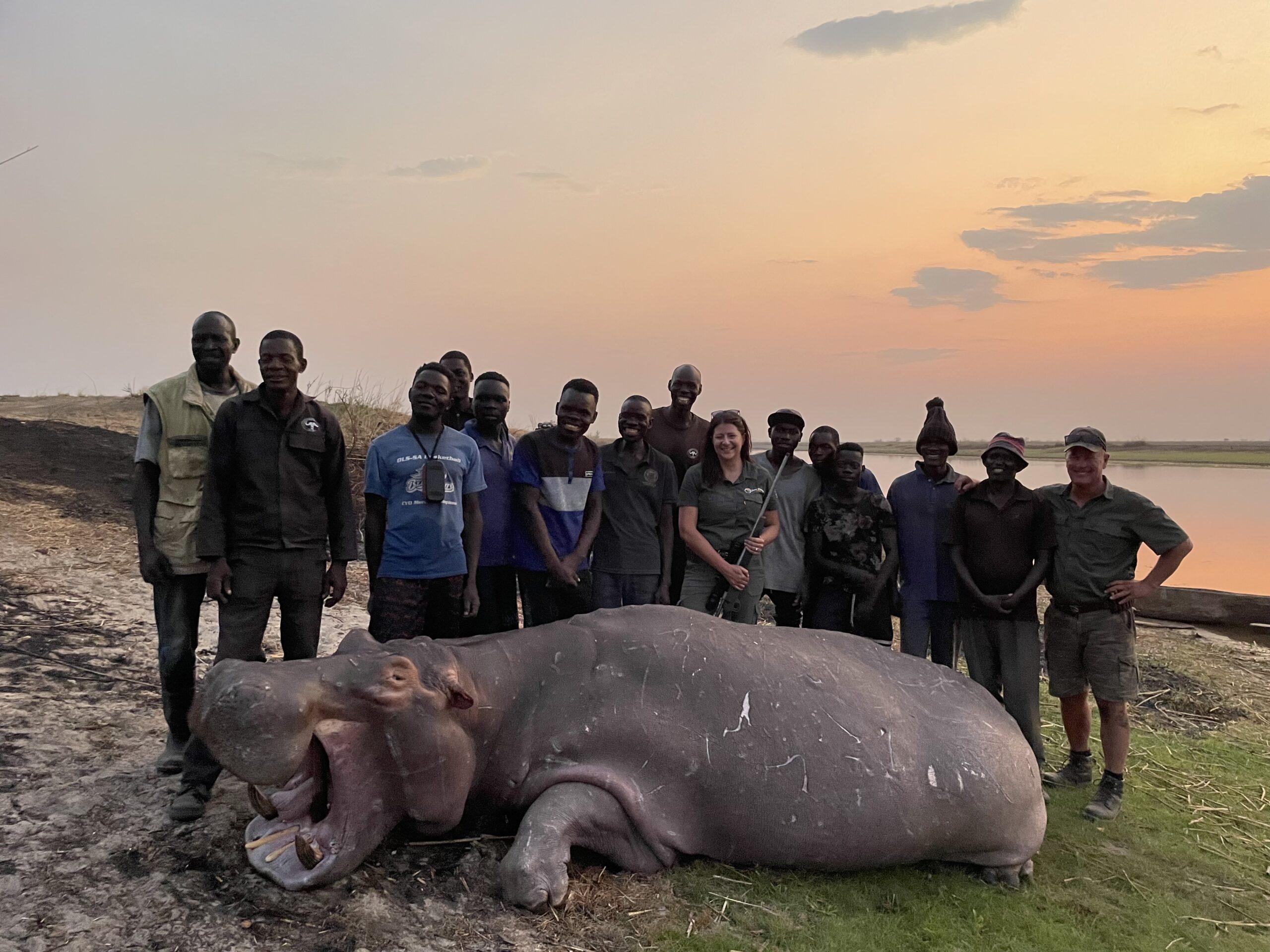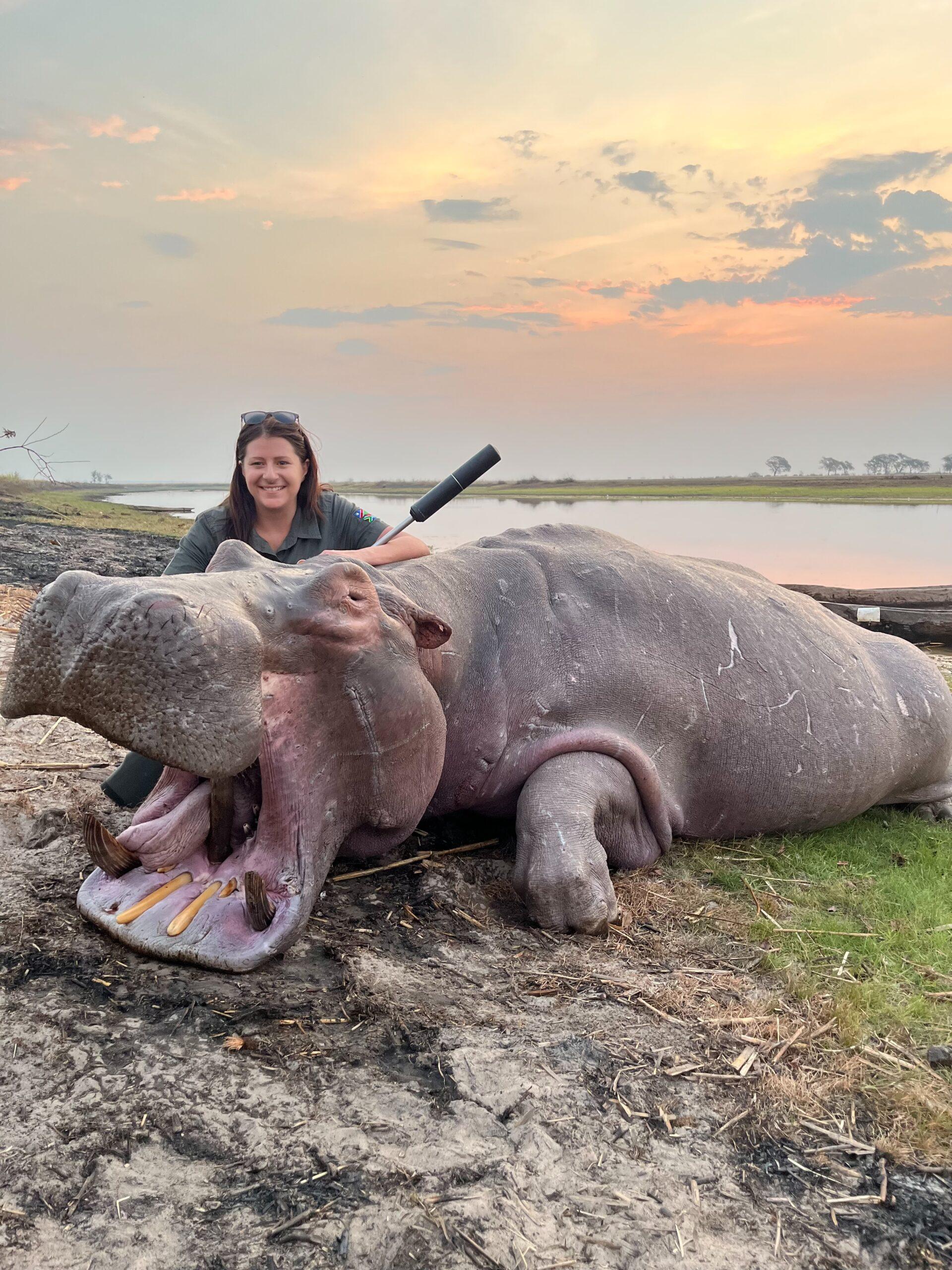 Tamlyn and her professional hunter were ideally wanting the Hippo Bull out of the water, but only a few “head shots” were presented. It is exceptionally difficult to take the “perfect” shot on a Hippo.