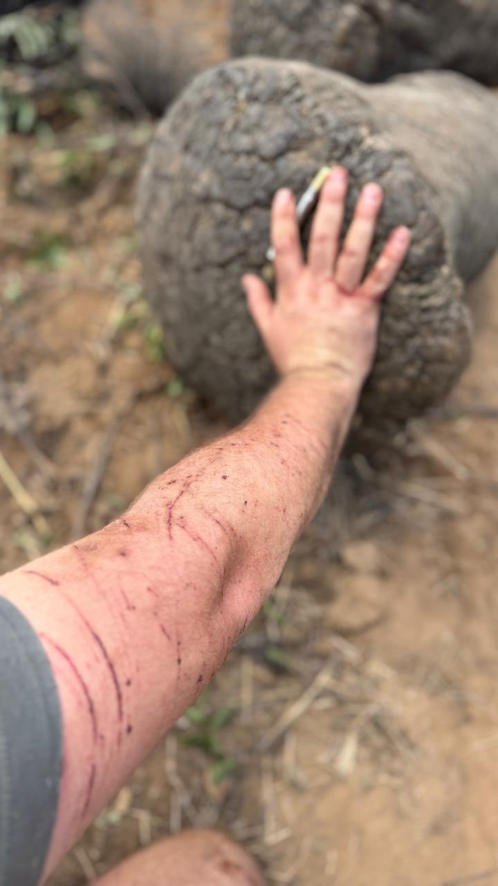 Finding suitable tracks a few days in, a bull was spotted, and it was game on. After stalking through thick brush, Keenan managed to take a side brain shot at 7 yards. The first bullet missed the brain by an inch, but the impact and energy stunned the bull enough to drop him flat and allow for follow up shots.