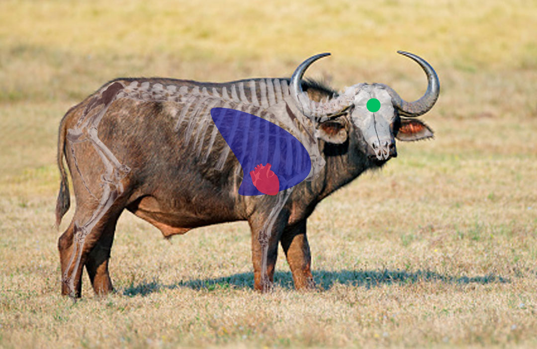 - Shot placement is a third of the way up directly above the front shoulder, ensuring a heart or double lung shot.