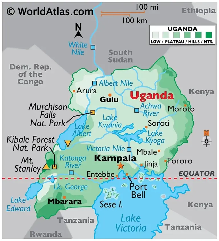 Uganda is a landlocked country in central Africa, bordered by Kenya, Tanzania, Rwanda, South Sudan, and the Democratic Republic of Congo. The country is situated on the East African plateau, bordered by a rim of mountain ranges.