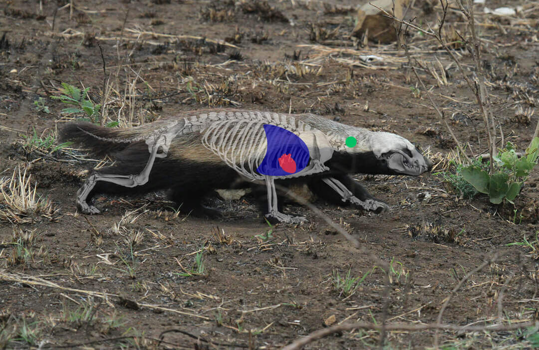 A small rifle caliber such as a .22 centerfire or .243 will get the job done, one may also consider a shotgun for an aardvark game hunting safari. If the hunter is limited to a larger caliber rifle such as a .308 Winchester Magnum, 30-06 Springfield, or 300 PRC, they might want to consider using monolithic bullets. An expanding monolithic bullet will create a smaller exit wound hole when compared with lead-core projectiles, while a non-expanding monolithic will create a hole the exact diameter of the projectile. A big-bore rifle could be used, but only with the use of non-expanding monolithic bullets. The rifle should be fitted with a good quality scope which they are comfortable shooting. The use of a thicker reticle will allow for quick target acquisition and shooting in low-light conditions, or with the use of an artificial light.