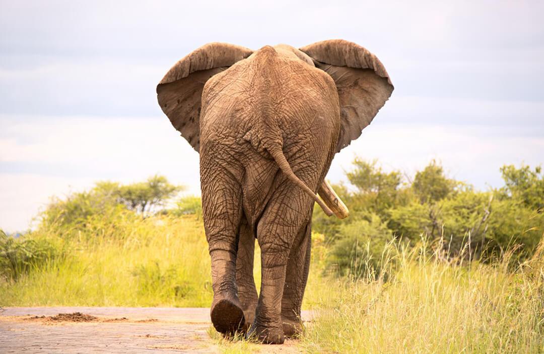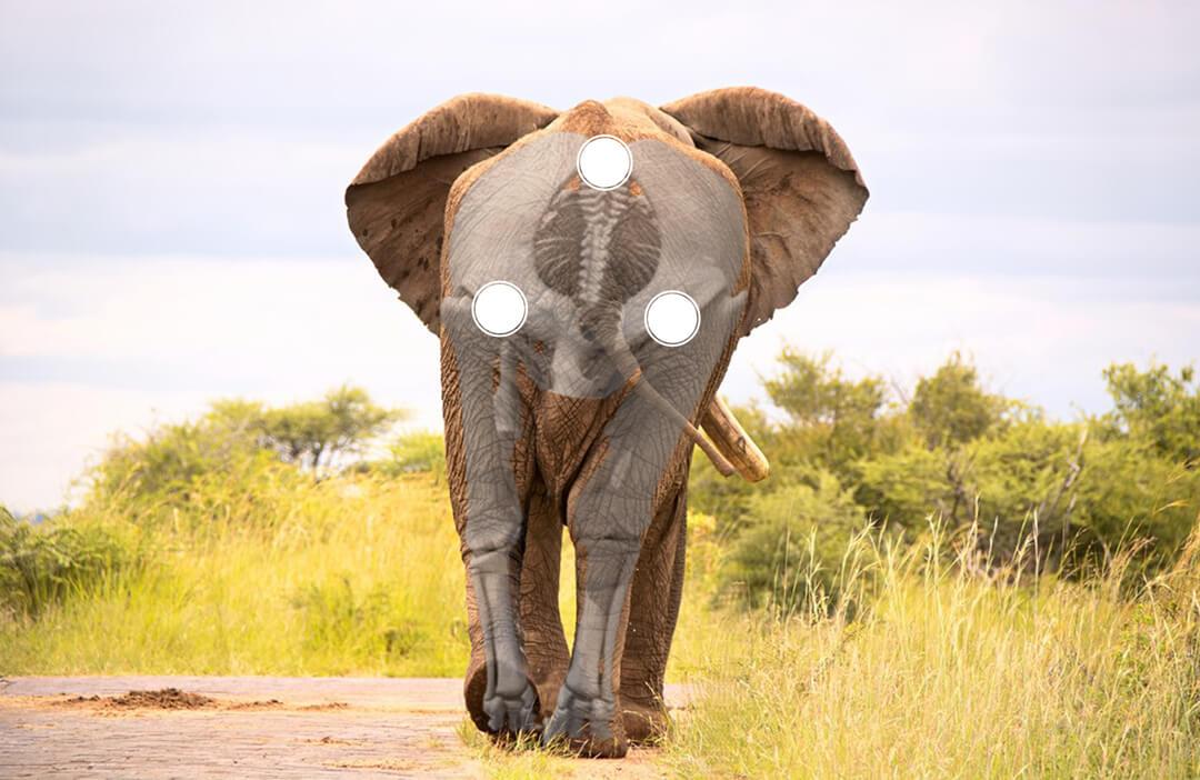 An African elephant after being shot and wounded, like most game animals, will turn away and flee from ever-present danger. The fleeing shot options are used regularly as the intent is to kill the elephant humanely and not to let him escape. The first option with the elephant running in the opposite direction will be the spine shot which is visible above the ridge of the tail. A direct hit into the vertebrae from this angle will immobilize the elephant. With the elephant running and the target smallish and mobile, this will be quite a difficult shot. This shot placement shot is named the “Texas Heart Shot” even though from this angle it is unlikely that vitals will be reached and penetrated. The second option is breaking the hips of the elephant. From the rear, the hip joint is visible at about the same level as the base / join of the tail to the body. Breaking a hip bone will most certainly slow down this mighty adversary. Many professional elephant hunters prefer shooting into the hip as the target is larger.